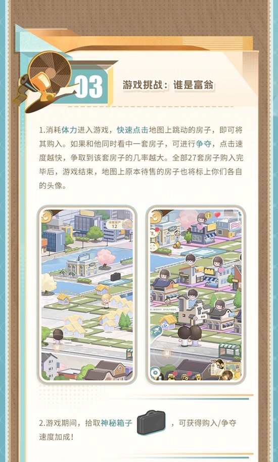 消耗体力进入游戏,快速点击地图上跳动的房子,即可将其购入。如果和他同时看中一套房子,还可进行争夺。游戏期间,拾取神秘箱子,可获得购入/争夺速度加成!