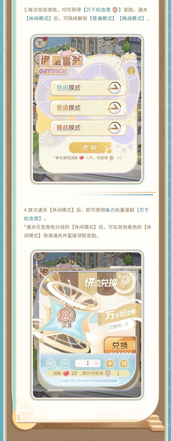 每次完成游戏,均可获得【万千纪念章】奖励。首次通关【休闲模式】后,即可使用体力批量速刷【万千纪念章】。
