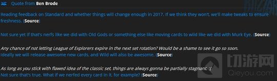 这三个系列在2017年第一个新版本上线时退环境。一次性将退3个版本,208张牌。不过年底和明年初将会是连续两个大系列,这也是炉石摆脱之前设计规划后首次连续2个大系列,按照惯例将补充接近300张新牌。根据营地的观察古神和卡拉赞是早在去年就设计好的系列,而退环境的引入可能不是一开始就决定的,所以从设计角度和环境更替产生了些许矛盾,不知道年底这个今年设计的系列会不会给大家眼前一亮的感觉。