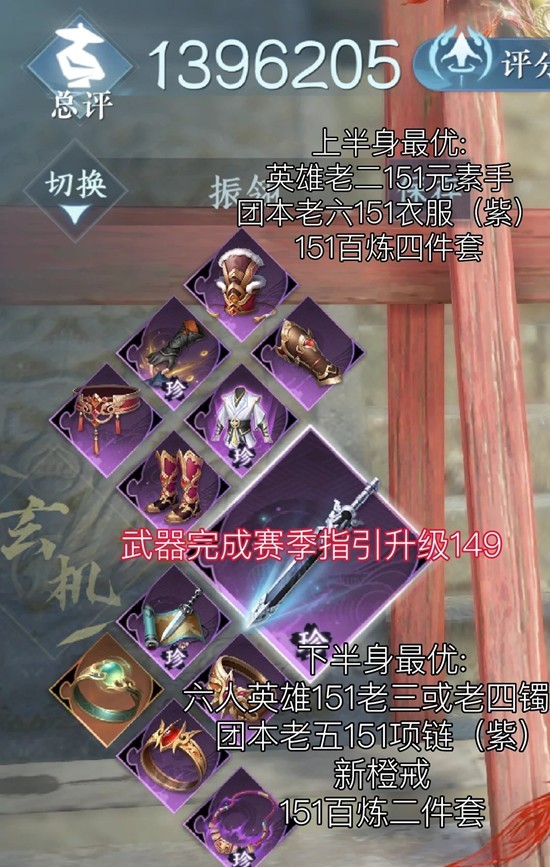 最优:英雄六人老二151元素手+团本老六151紫衣服+151百炼四件套