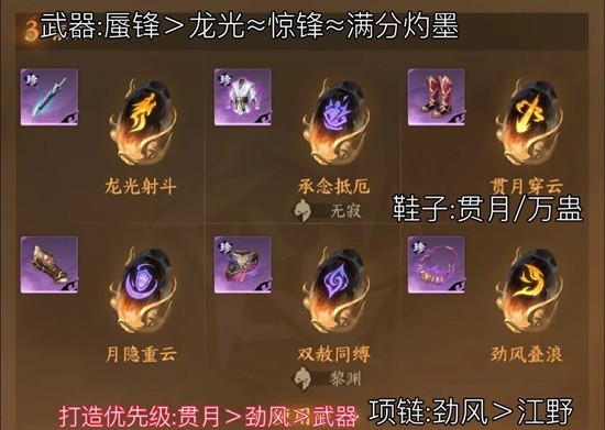 打造优先级:鞋子(贯月)>项链(劲风)>武器