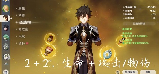 圣遗物推荐2生命+2输出类型,图上带的是物伤杯,攻击杯也可以,若生命达不到3.5万可选用生命杯
