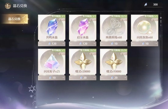 奇迹之冠界面右下角有一个晶石兑换,点进去页面如图,可以换共鸣水晶,大家不要忘记啊。好像也是周期性更新的。