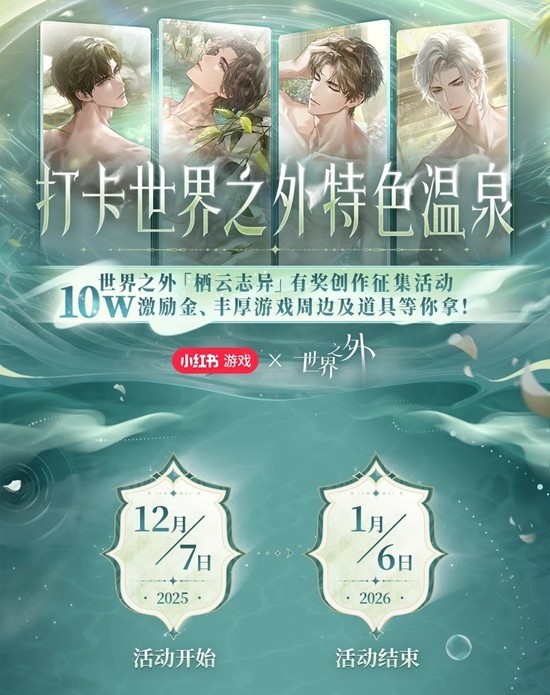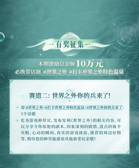 世界之外栖云志异主题特色温泉创作激励活动现已开启~2025年12月7日 - 2026年1月6日,化身游戏种草官,发布安利《世界之外》的相关内容,可以分享令你惊艳的副本、印象深刻的剧情、盘点的新手攻略、心动的瞬间、真实的游戏体验、推荐的周边好物等,即可参与现金瓜分,一起来和小编看看吧~