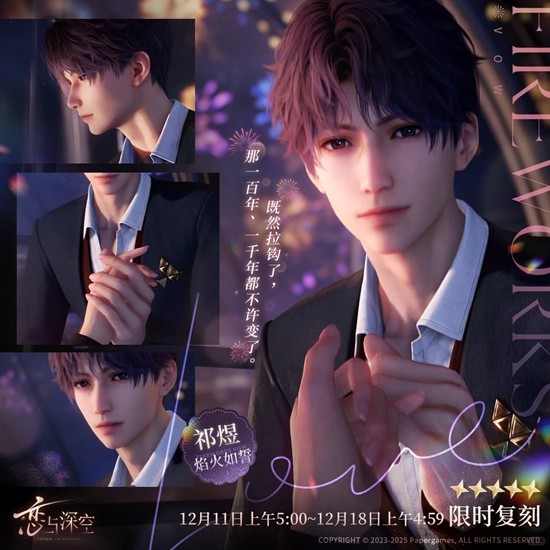 恋与深空五星思念UP许愿「晚空微澜」12月11日限时复刻~活动期间,使用「深空许愿券」或「时光许愿券·限时」参与复刻许愿,限定五星思念「祁煜·焰火如誓」许愿概率限时大幅提升。本张思念将暂无获取途径,不会进入常驻许愿极空回响中。一起来和小编看看吧~