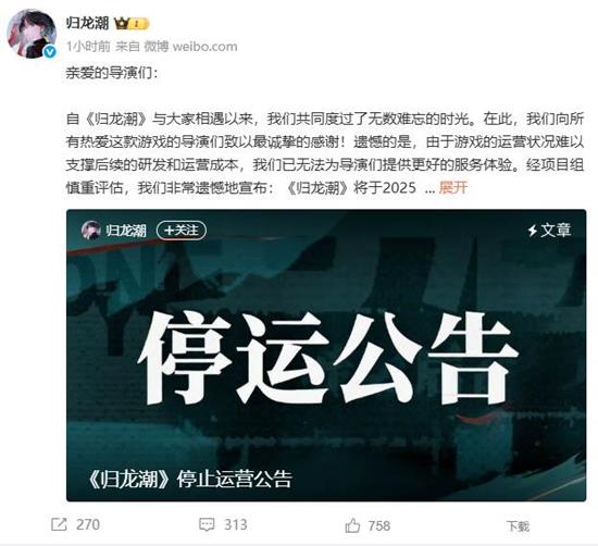 2025年12月10日,二次元国风游戏《归龙潮》在公测上线仅一年后,宣布正式停止运营。游戏开发商通过官方社交媒体账号和游戏内公告发布了这一消息,并表达了对玩家的感谢。