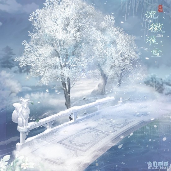 【流徽濯雪】含全新妆容“冰绡裁音”,特殊姿势上衣“流徽濯雪”、“清川无穷”,精美可移动摆件“雾凇簌声”、“晴雪驿桥”。