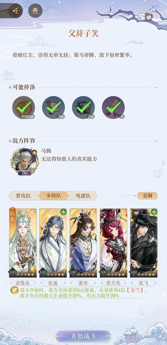 ③马腾大招后看身上数字必须是偶数,A几下就消几层,数字越少受到伤害越低,张邈看着助剑消,消不到2层or4层就下拉,后期4层的时候伤害也高就下拉,因为诸葛亮2星还可能会结算一次伤害所以如果是二星诸葛亮让诸葛亮先出手好控一点,张飞下拉不攻击,必晕董奉不用管没有生存压力