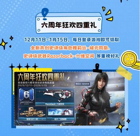 12月11日至1月4日上线就送使命召唤手游六周年回馈礼,邮件一键领取,卡片直接抽商城,幸运币可换限时点券,零氪也能十连。