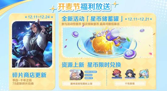 福利板块上线“星币储蓄罐”,12月11日至12月25日每日存入10星币,12月26日统一结算,最高随机翻倍至200%,存满七天额外送荣耀积分×50。