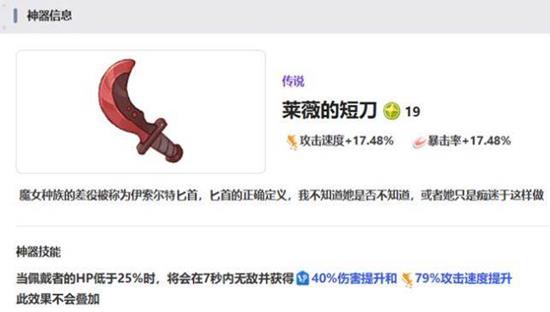 它拥有17.48%的攻击速度和可观的暴击率加成。当装备者的生命值低于25%时,会触发一个强大的效果:获得长达7秒的无敌状态,同时攻速提升79%,伤害提升40%,堪称绝地翻盘的神器。