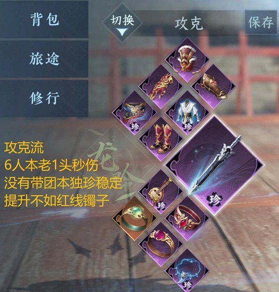攻克流最优为6人本英雄头/团本腰带+红线镯子+团本独珍老6衣服+攻击项链