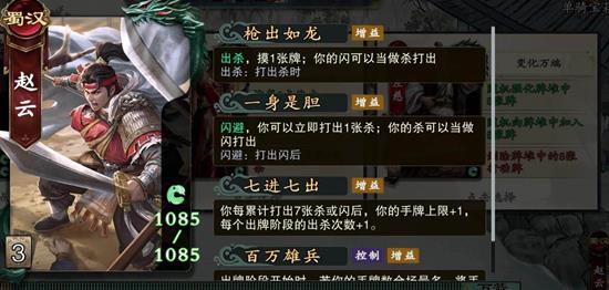 另一个技能“以身试胆”则让他在使用闪牌时,可以立即借出一张杀牌,这张杀牌也能当作闪来打出。而“七进七出”技能则是在累计打出七张杀牌或闪牌后,提升自己的手牌上限。这使得赵云在累积卡牌数量和出杀次数上都更具优势。