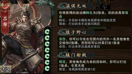 吕布在三个城池战中都有登场的机会,但他的发挥需要一定的运气和装备支持。玩家在使用吕布时需要关注“诸葛连弩”和其专属武器“方天画戟”是否上场。他的技能“温侯无双”可以利用战法牌连续变换出两张杀牌,并且打出的杀无法被闪避。而“狼子野心”技能则让吕布通过杀造成伤害后,可以从攻击范围内的角色处获得两张牌,从而持续强化自己的攻势。