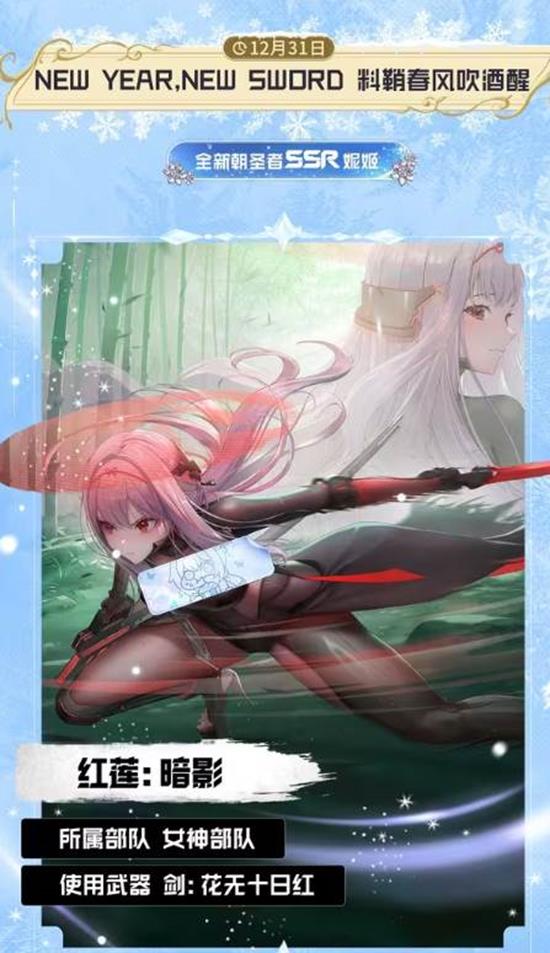 「NEW YEAR,NEW SWORD料峭春风吹酒醒」活动将于12月31日开启,带来全新朝圣者5SR妮姬「红莲:暗影」。