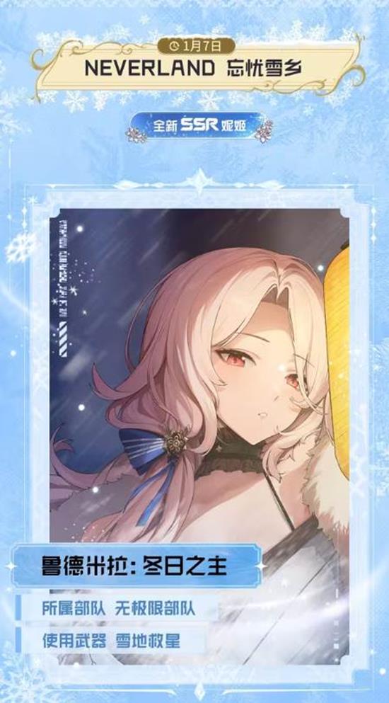 参与「NEVERLAND忘忧雪乡」活动,可获得全新5SR妮姬「鲁德米拉:冬日之主」。