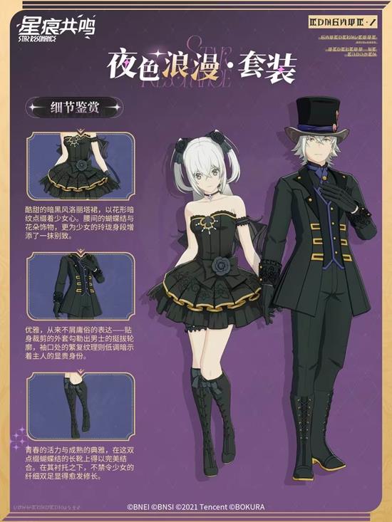 “夜色浪漫”时装以经典的黑白配色为主,融合了优雅的设计元素,为角色增添了一抹别样的风采。女性角色的洛丽塔裙以花形暗纹点缀,腰间的蝴蝶结与花朵饰物为少女的玲珑身段增添了一抹别致。男性角色的外套则勾勒出挺拔轮廓,袖口处的繁复纹理则低调暗示着主人的显贵身份。