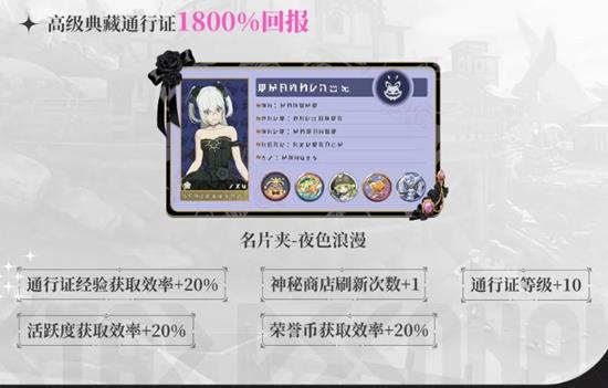 高级典藏通行证1800%回报:除了丰富的游戏道具外,还包括名片夹-夜色浪漫,提供通行证经验获取效率、神域商店刷新次数、通行证等级以及荣誉币获取效率的加成。