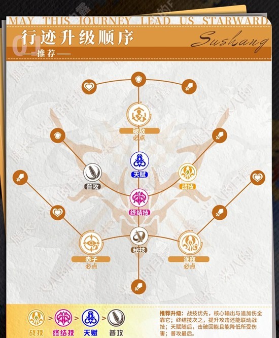 推荐升级:战技优先,核心输出与追加伤全靠它;终结技次之,提升攻击还能联动战技;天赋随后,击破回能且能降低所受伤害;普攻最后。