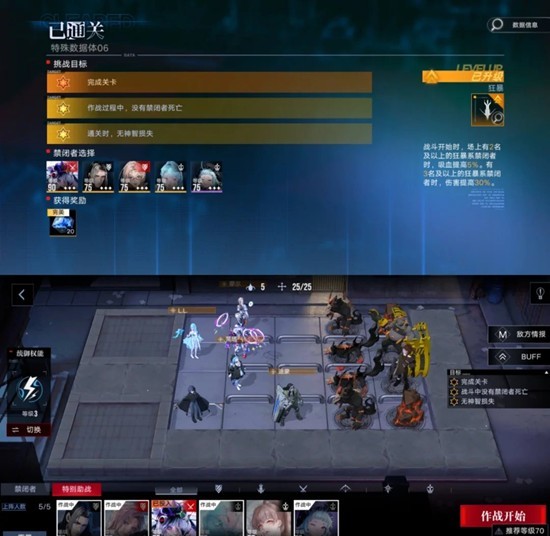 L1-6,考验手速的时刻来了。buff-启迪和坚韧,禁闭者:迪蒙、000、摩尔、莱塔、LL,除了30,其他都是特别助战。开局立刻!马上!30点二技能,摩尔(加盾加伤)LL(回能加伤)技能挂30身上,再喂豆子给30,30开大,再给豆子,再开大,如此一口气快速重复3-4次30开大,怪就打完了,只留下最下面一只怪,禁闭者移过去养生打就行了。【核心:操作速度要快!怕30暴毙可以抽空让迪蒙开个大莱塔只是抓来凑启迪buff的】