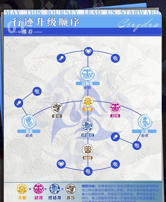 推荐升级:刻律德菈的行迹加点需紧扣其战技复制和攻击力转化暴击伤害的核心机制,优先点满天赋和战技以最大化辅助效率,终结技可后续补充,普攻完全舍弃。同时,通过遗器和词条进一步强化攻击力和速度属性,可显著提升其作为同谐角色的辅助价值。