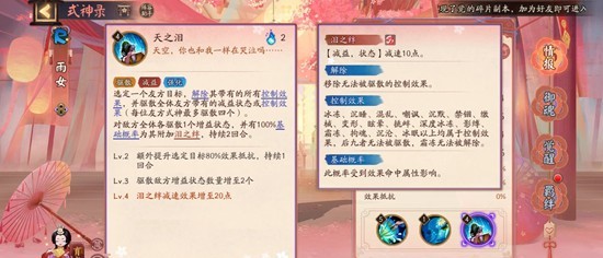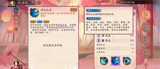 三技能:选定一个友方,解除其所有控制效果增加80%的效果抵抗,并驱散全体友方的减益或控制效果(每个友方式神最多四个)。对敌方全体驱散2个增益状态,有概率减速对面。