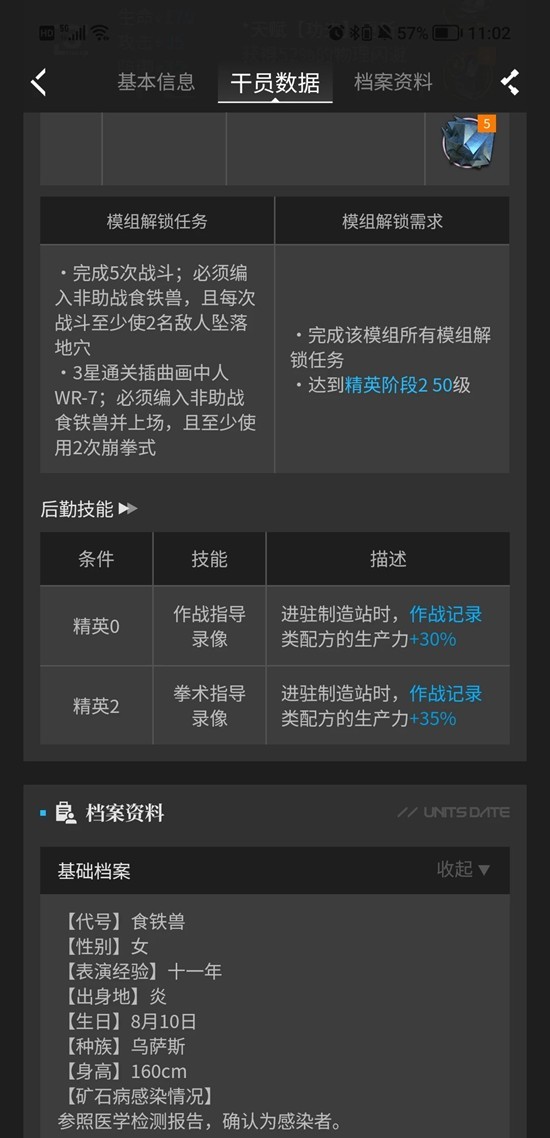 5.食铁兽的基建技能精0就能+30%作战记录类配方的生产力,主包之前一直不知道,把她当仓管,精二后是+35%