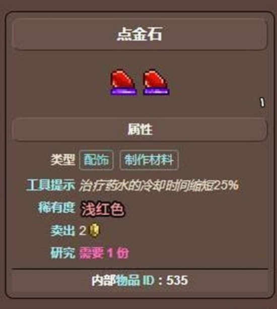 点金石的主要作用是减少“耐药性”减益的持续时间。当你在泰拉瑞亚里使用生命回复药水后,会进入一个短暂的冷却时间,无法立即再次使用。装备点金石可以将这个冷却时间缩短25%,这在激烈的战斗或探索中能显著提升你的生存能力。
