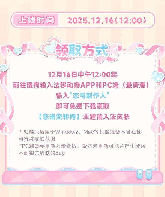 前往搜狗输入法移动端APP和PC端(需升级至最新版),输入"恋与制作人",即可免费下载领取「恋语流转间」主题输入法皮肤。