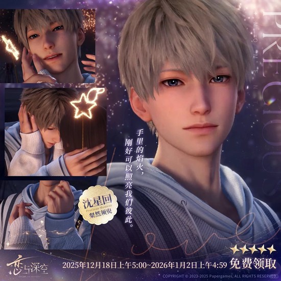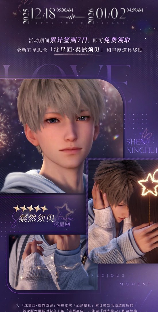 恋与深空「心动挚礼」五星思念、丰厚奖励签到即送~活动期间,累计签到7天,即可免费领取全新五星思念「沈星回·粲然须臾」。除五星思念外,活动期间累计签到15天,共计可免费领取「钻石*2000、极空许愿券*10、快乐巧克力*5000、体力*2000」和丰厚培养道具奖励。一起来和小编看看吧~