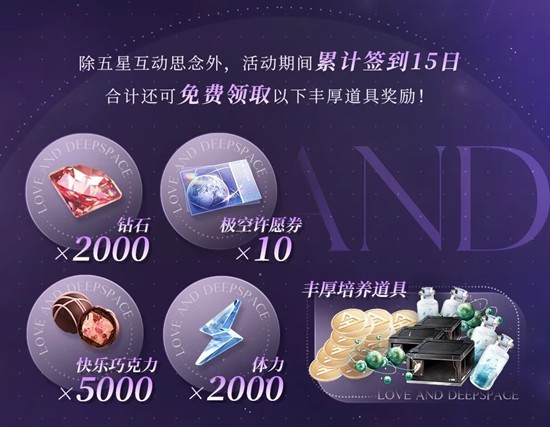 除五星思念外,活动期间累计签到15天,共计可免费领取「钻石*2000、极空许愿券*10、快乐巧克力*5000、体力*2000」和丰厚培养道具奖励。