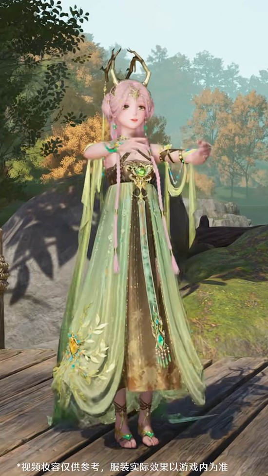 基础套「青野漫林歌」通过「晨露纤维」可进化为「青野漫林歌·晨露」,色调由嫩绿转乳白;再消耗「暮影果实」获得「青野漫林歌·暮影」,裙摆加入夜空星屑,鹿影从白变蓝紫,夜拍自带荧光。两种材料均可在同期「鹿野祈歌」活动中兑换,完成每日任务约能白嫖一半需求量。