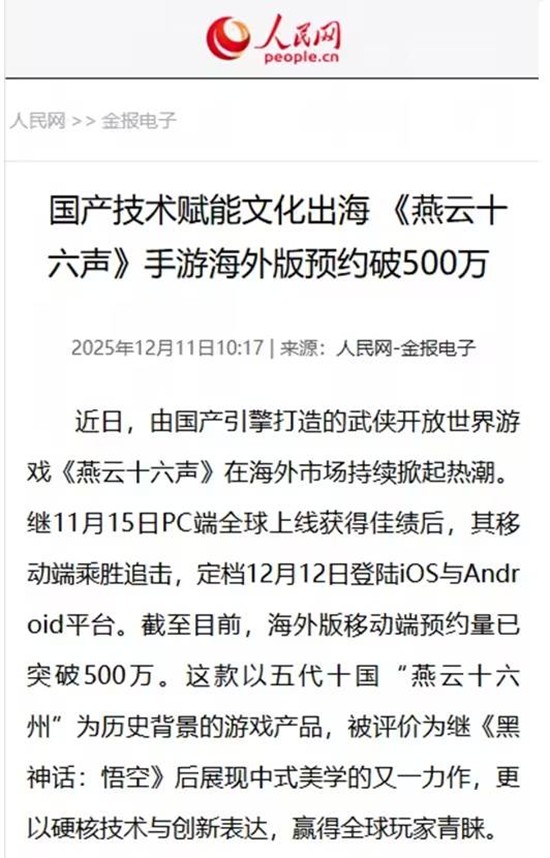 权威媒体亦聚焦这股“东方武侠热”。新华社刊发《中国武侠如何打动全球年轻玩家》专访,被人民日报、光明网、中国青年网等转载;人民网肯定其“数字文保”思路,将开封古城、汴水虹桥1:1搬进游戏;北京日报则点赞海外社区自发翻译《将进酒》、探讨招式的“文化自来水”现象。
