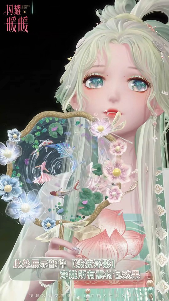内容:闪耀可幻色水扇「浅波浮影」+蜻蜓&莲叶&浮花&金鱼素材包+粉钻×180+金币×5w