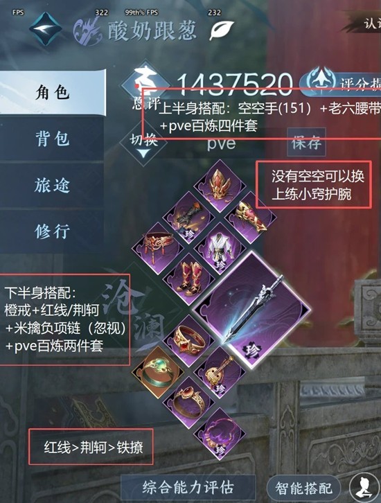 下半身搭配:红线>荆轲+橙戒+pve151百炼两件套+米擒负项链紫色>蓝色