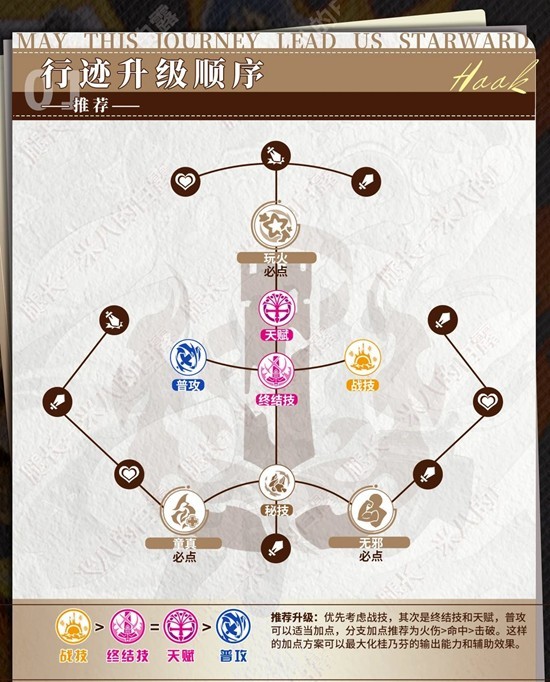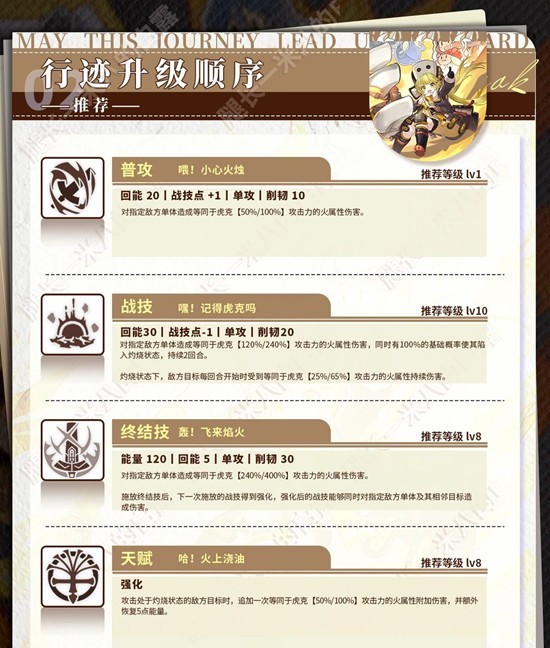 推荐升级:优先考虑战技,其次是终结技和天赋,普攻可以适当加点,分支加点推荐为火伤>命中>击破。这样的加点方案可以最大化桂乃芬的输出能力和辅助效果。