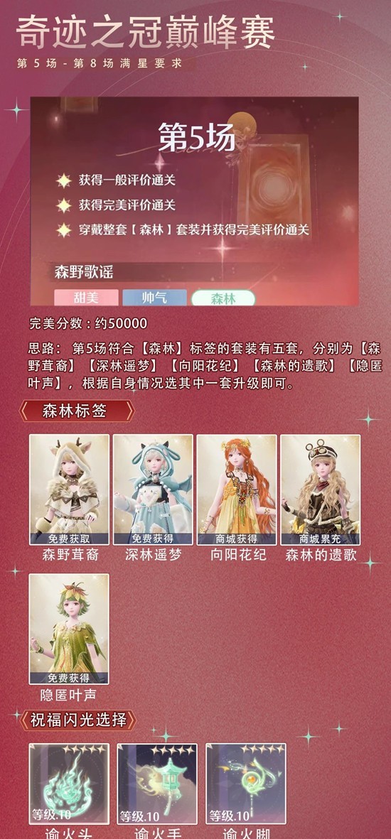 > 第5场符合【森林】标签的套装有五套,分别为【森野茸裔】【深林遥梦】【向阳花纪】【森林的遗歌】【隐匿叶声】,【向阳花纪】需要与高分外套搭配才能过关,根据自身情况选其中一套升级即可。