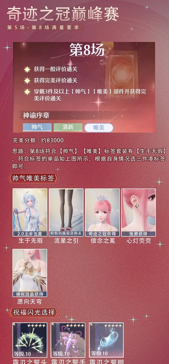 > 第8场符合【帅气】【唯美】标签套装有【生于无瑕】,符合标签的单品如上图所示,根据自身情况选三件凑标签即可。