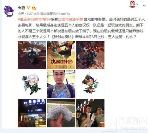 3DMMO浪漫冒险手游精品《新剑与魔法》新版“决战红叶谷”上线以来受到广大勇士称赞!在新版热度持续升温之时,又一火爆消息传来!“新剑魔”玩家参与“火狼”集结5人免费看电影活动,成为当晚唯一一组成功召集5人小组,使狼叔及多位网上名人感慨颇多。因此,《新剑与魔法》将提供“火狼”本次活动所有电影票费用!