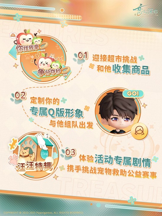 与夏以昼一起整理货架,完成超市挑战,累积积分即可领取通用头饰「饼干密语」、聊天气泡「摇铃果果」、「黑电能量·重磅」及「快乐巧克力」奖励!