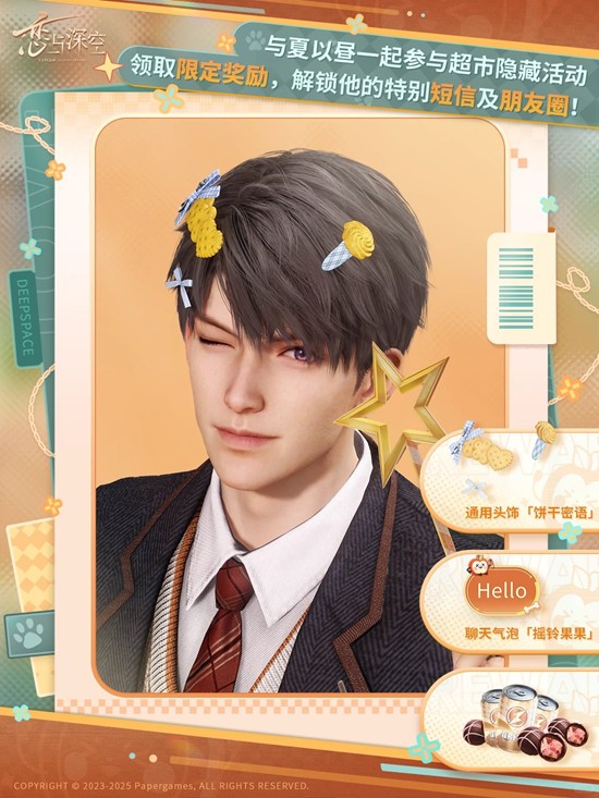 参与活动,体验专属剧情,免费获取通用头饰「饼干密语」、聊天气泡「摇铃果果」、黑电能量·重磅和快乐巧克力,还可解锁夏以昼的特别短信及朋友圈!