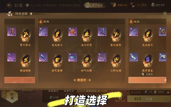 ⑥ 打造:武器-龙光射斗略好于层峦蕴力;鞋子-裂空破势>摧金断玉>九曜裂宇>凛脉催元;项链-江野化锦(加强振翎万锋)。防具的话有【竞技】标签可以优先上,没有的话也是把收益显示切到【试剑天下】那里看每个打造的《攻防能力》来选就行