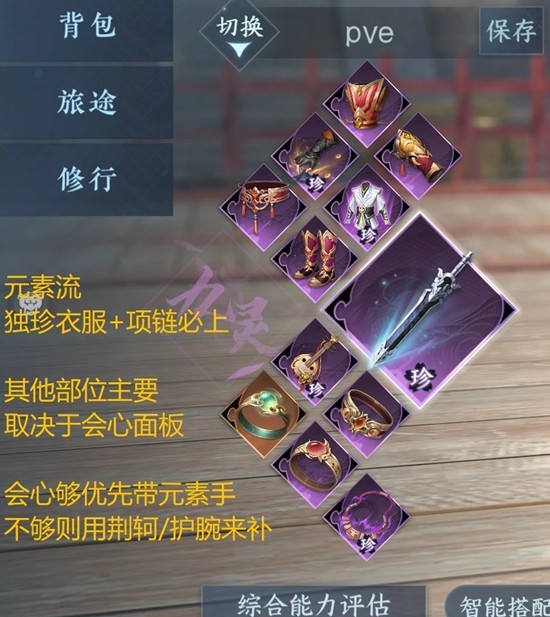 会心够优先带元素手,不够则用荆轲/护腕来补