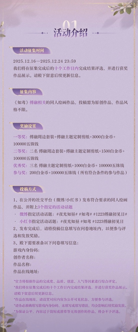 如鸢傅融初见日二创征集活动现已开启~和他的初见日即将到来,“夜光如昼”主题二创活动现已开启。请殿下在完成发布后,务必提交登记问卷。登记提交问卷并完成登记,才能参与后续的评选和发奖。拿起手中的画笔,绘制独一无二的记忆吧~