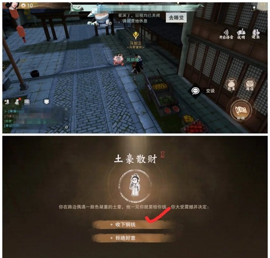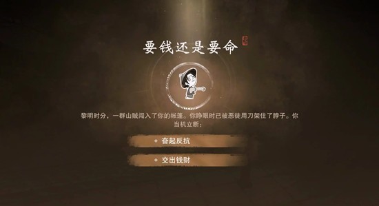 6.第六天下午参加文斗/武斗,在晚上睡觉前把所有钱花完,晚上有山贼选择给钱。