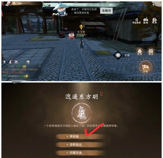 3.第三天看体力情况学习/赚钱,晚上找东方明对话有在练领取8点武学属性书。