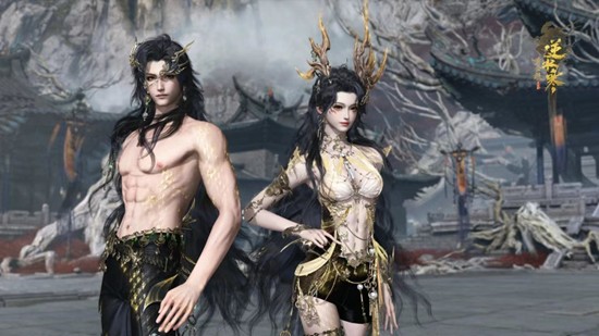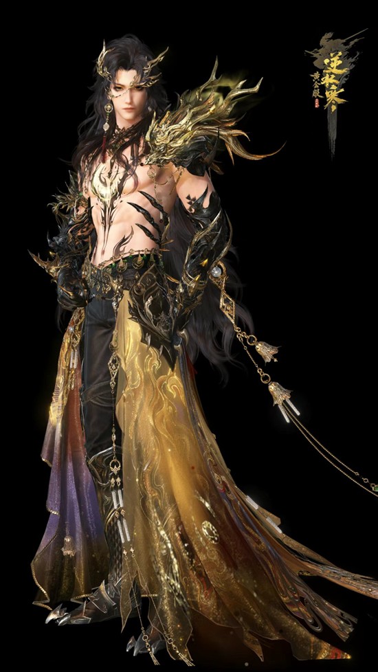 男款一身黑色劲装,肩头的龙头盔甲和金龙缠绕的护臂,散发极具压迫感的力量。霞光凝结于轻纱拖尾之上,暗金和黛紫流淌,为硬朗增添一丝灵动。