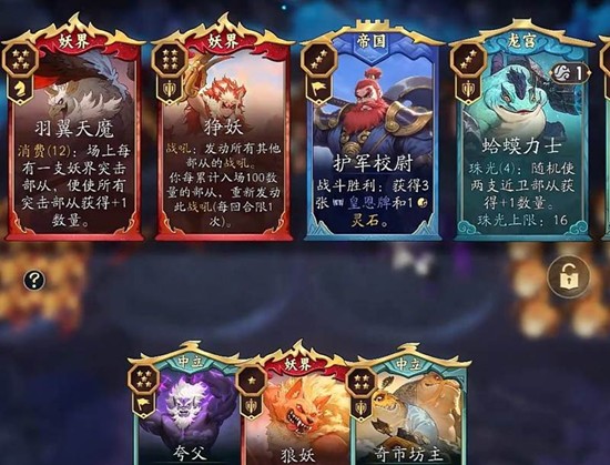 它的战吼效果能为玩家提供妖界宝箱,开出随机的妖界部从。通过搭配狰妖、黄风怪以及金翅大鹏,可以实现所谓的“电表倒转”,即在保证有充足灵石进行运营的同时,又能大量获得部从并频繁触发战吼,从而快速提升妖界部从的数量。
