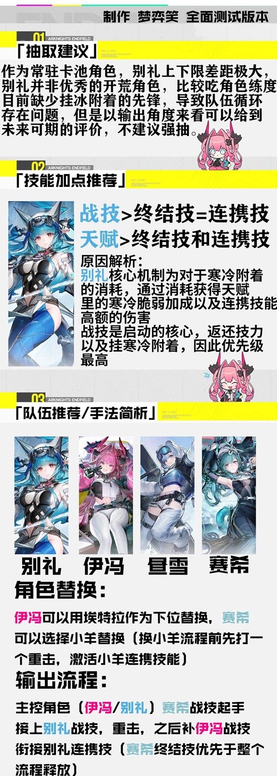作为常驻卡池角色,别礼上下限差距极大别礼并非优秀的开荒角色,比较吃角色练度目前缺少挂冰附着的先锋,导致队伍循环存在问题,但是以输出角度来看可以给到未来可期的评价,不建议强抽