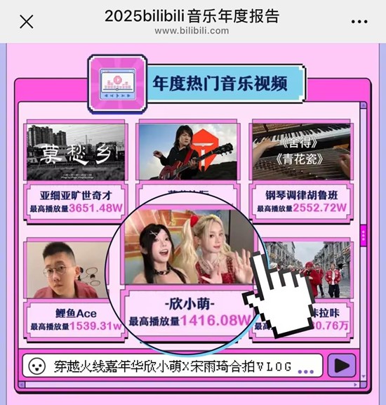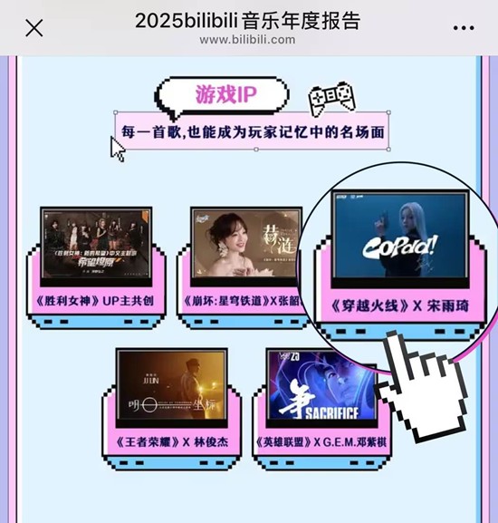 B站2025音乐年度报告于12月18日正式发布,穿越火线手游与宋雨琦跨界合作的主题曲《COPDD》成功入选“年度游戏IP音乐”榜单,成为今年唯一上榜的FPS品牌歌曲。同期,嘉年华期间释出的欣小萌×宋雨琦合拍VLOG亦跻身“年度热门音乐视频”,CFM音乐内容在B站实现双线开花。